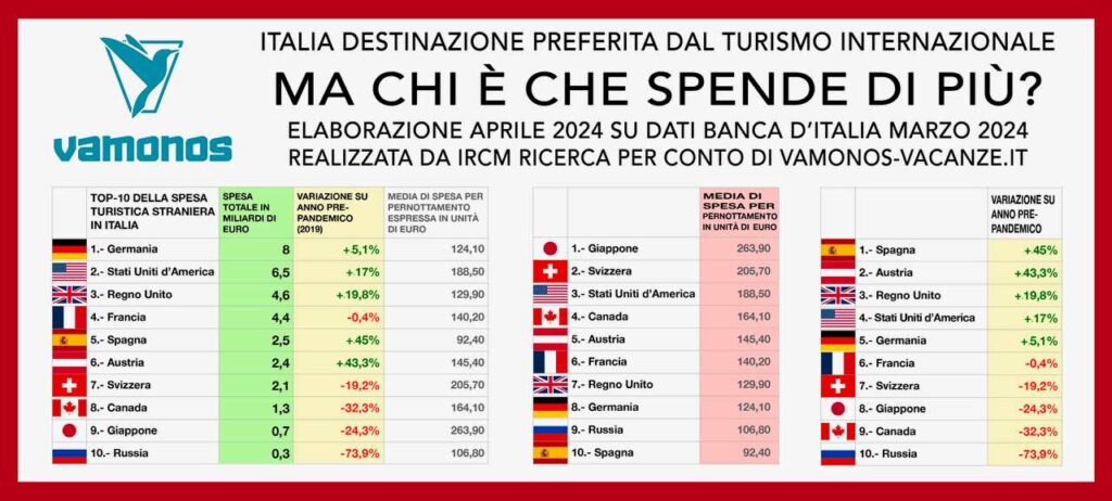 Ma sono in crescita anche i turisti statunitensi, che hanno registrato un forte aumento della spesa totalizzando 6,5 miliardi di euro (+17% rispetto all’anno pre-pandemico). «La spesa media per notte degli statunitensi è molto alta, pari a 188,50 euro» osservano gli analisti di Vamonos-Vacanze.itQuesto valore è superato solo dai visitatori giapponesi (263,90 euro), ma con una spesa totale molto inferiore (pari a 0,7 miliardi di euro) e dai turisti svizzeri (205,70 euro) con una spesa totale di 2,1 miliardi di euro.